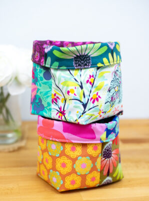 Har du några tygbitar från layercakes liggande kan du sy fina förvaringskorgar av dem. Du behöver bara fyra tygbitar. Om du vill sy av andra... Läs mer